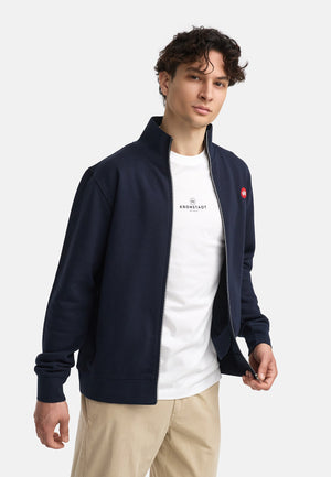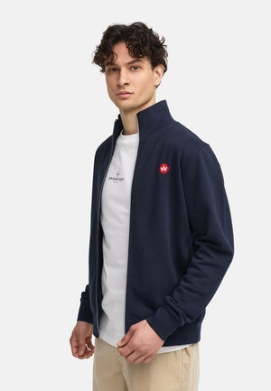 This sporty-inspired sweat jacket with a full-zip closure and high collar combines functionality with contemporary design. The clean silhouette, subtle logo, and comfortable fit make it the ideal all-rounder for leisure, sports, or relaxed everyday outfits. Crafted from a high-quality material blend of 60% organic cotton and 40% recycled polyester, the jacket offers several advantages: The organic cotton ensures a pleasant, soft feel against the skin and is particularly breathable and environmentally friendly. The recycled polyester gives the fabric durability, shape stability, and an easy-care finish. This sustainable use of materials combines comfort with the responsible use of resources. A versatile sweat jacket for conscious fashion lovers who value quality, comfort, and sustainability.